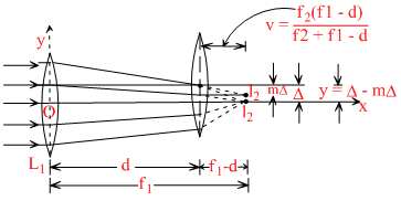 From the first lens parallel beam of light is focused at its focus i.e., at a distance f1 from it. The image I1 acts as virtual object for scrond lens L2, Therefore, for L2