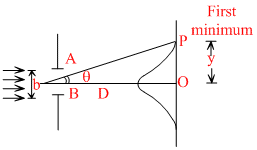 .......(i) Now, at P (first minima) path difference between the rays reaching from two edges (A and B) will be