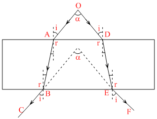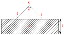 A diverging beam of light from a source S having divergence angle fall symmetrically on a glass slab as shown. The angles of incidence of the two extreme rays are equal. If the thickness of the glass slab is t and its refrective index is n, then the divergence angle of the emrgent beam is