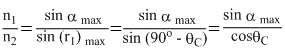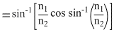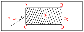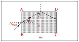 A rectangular glass slab ABCD of refractive index is immersed in water of refractive index n2 (n1 > n2). A ray of light is incident at surface AB of the slab as shown. The maximum value of the angle of incidence αmax, such that the ray comes out only from the other surface CD, is giiven by