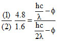 When radiation of wavelength λ is incident on a metallic surface, the stopping potential is 4.8 volts. If the same surface is illuminated with radiation of double the wavelength, then the stopping potential becomes 1.6 volts. Then the threshold wavelength for the surface is :-