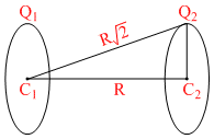 Two identical thin rings, each of radius R, are coaxially placed a distance R apart, If Q1 and Q2 are respectively the charges uniformally speread on the two rings, the work done in moving a charge q from the centre of one ring to that of the other is