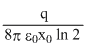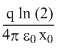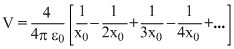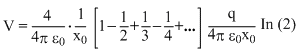 A charge + q is fixed at each of the points x = x0, x = 3x0, x = 5x0 ...... ∞ on the x-axis and charge - q is fixed at each of the points x = 2x0, x = = 40, x = 60 .... ∞ Here, x0 is a positive constant. Take the electric potential at a point due to charge Q at a distance r from it to be Q/4πε0r. Then the potential at the origin to the above system of charge is