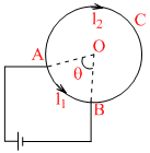 A battery is connected between two points A and B on the circuimference of a uniform conducting ring of radius r and resistance R. One of the arc AB of the ring substends an angle θ at the centre. The value of the magnetic induction at the centre. The value of the magnetic induction at the centre due to the current in the ring is
