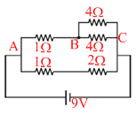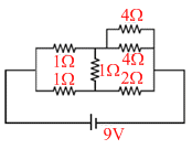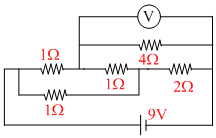 Find current through the resistance 4Ω if resistance of voltmeter is 4Ω.