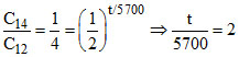 An archaeologist analyses the wood in a prehistoric structure and finds that C14 (Half life = 5700 years) to C12 is only one-fourth of that found in the cells of buried plants. The age of the wood is about