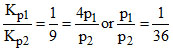 The equilibrium constant Kp1 and Kp2 for the reactions X ⇋ 2Y and Z ⇋ P + Q ; respectively are in the ratio of 1 : 9. If the degree of dissociation of X and Z be equal then calculate value of