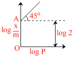 The graph between log(x/m) and log P is a straight line at angle 45o with intercept OA as shown. Hence (x/m) at a pressure of 2 atm is