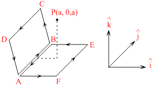 he magnetic field at P(a, 0, a) due to the loop is equal to the vector sum of the magnetic fields produced by loops ABCDA and AFEBA as shown in the figure.