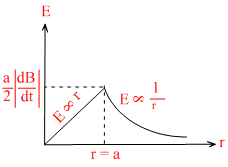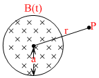 A uniform but time varying magnetic field B(t) exists in a circular region of radius a and is directed into the plane of the paper is shown. The magnitude of the induced electric field at point P at a distance r from the centre of the circular region