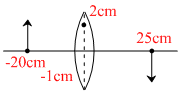 The principal axis of a convex lens is along x axis. The coordinates of an object and image are (-20cm, 2cm) and (25cm, -1cm). Lens is located at :-