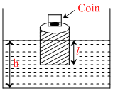 A wooden block, with a coin placed on its top, floats in water as shown in figure the distance l and h are shown there. After some time the coin falls into the water. Then :-