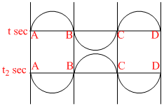 For transverse stationary wave in string follow two picture are shown, freq of system is 250 Hz. Then correct statement for difference between t1 & t2 is :-
