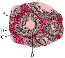 Identify A, B, C and D in digrammatic sectional view of seminiferous tubule.