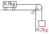 A cart of mass 0.5 kg is placed on a smooth surface and is connected by a string to a block of mass 0.2 kg. At the initial moment the cart moves to the left along a horizontal plane at a speed of 7 m/s. (Use g = 9.8 m/s2)