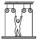 A man of mass m stands on a platform of equal mass m and pulls himself by two ropes passing over pulleys as shown. If he pulls each rope with a force equal to half his weight, his upward acceleration would be :