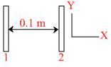 Two insulating plates are both uniformly charged in such a way that the potential difference between them is V2 - V1 = 20 V. (i.e., plate 2 is at a higher potential). The plates are separated by d = 0.1 m and can be treated as infinitely large. An electron is released from rest on the inner surface of plate 1. What is its speed when it hits plate 2 ?