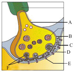 Given below is a diagram showing structures labelled as A, B, C, D, E and F in a chemical synapse :-