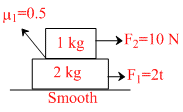 In the figure shown block of mass 2 kg is very long and ′t′ is the time. Force of friction on 1 kg block is :-