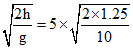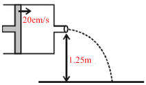 A syringe containing water is held horizontally at a length h = 1.25 m above the ground. The diameter of the piston is 5 times that of the nozzle. The piston is pushed with a constant speed of 20 cm/s. (g = 10 m/s2)