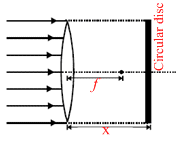 The figure shows a lens of focal length f and a circular disc of same aperture as that of lens. Parallel lights are falling on the lens. The circular disc is moving away from the lens.