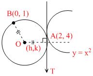 and slope of tangent at (2, 4) to y = x2 is 4. And (slope of OA). (slope of tangent at A) = - 1