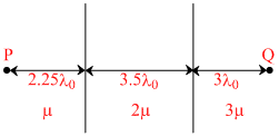 An electromagnetic wave of wavelength λ0 (in vacuum) passes from P towards Q crossing three different media of refractive index μ, 2μ and 3μ respectively as shown in figure. φP and φQ be the phase of the wave at points P and Q. Find the phase difference φQ - φP. [Take : μ = 1]