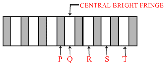 The figure shows the interference pattern obtained in double-slit experiment using light of wavelength 600 nm. P, Q, R, S and T are marked on five fringes .