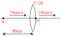 The figure shows initial positions of a source of light S and a light detector D. Both S & D move with velocity 10 cm/s, as shown. The converging lens of focal length 20 cm is fixed. Time instant(s) when the detector detects maximum intensity of light is /are