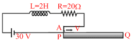 In the circuit shown in figure, A is a sliding contact which can move over a smooth rod PQ. Resistance per unit length of the rod PQ is 1 ohm/m. Initially slider is just left to the point P and circuit is in the steady state. At t = 0 slider starts moving with constant velocity v = 5 m/s towards right. Current in the circuit at t = 2 sec is :-