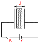 The area of the plates of the capacitor shown in figure is S. The dielectric constant and resistivity of the material of the slab inserted in the capacitor are K = 1 and ρ respectively. The emf of the ideal cell is V. The current flowing through dielectric slab immediately after the key is switched on is