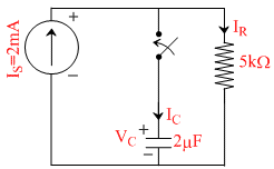 Consider a circuit with a constant current source of IS = 2mA with a capacitor of 2μF and resistor of 5kΩ (as shown in figure). At t = 0 the switch is closed. IC & IR denotes current in the capacitor & resistor branch respectively and VC represents potential difference across the capacitor. Choose the correct graph(s).