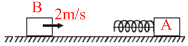 Figure shows a block A of mass 5 kg kept at rest on a horizontal smooth surface. A spring (K = 200 N/m) which is compressed by 10 cm and tied with the help of a string to maintain the compression is attached to block A as shown in figure. Block B also of mass 5 kg moving with 2 m/s collides with A, as shown. During the collision the string breaks and after the collision the spring is in its natural state. Assume the bodies to be elastic and let the velocities of A and B be v1 and v2 respectively assuming positive direction towards right, after collision. Then