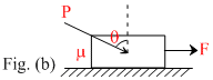 The coefficient of friction between the block and the horizontal surface is μ as shown in figure. The block moves towards right under action of horizontal force F(figure -a). Sometime later another force P is applied to the block making an angle θ(such that tanθ = μ) with vertical as shown in (figure - b). After application of force P, the acceleration of block shall