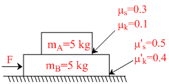 Static limiting frictional force on mass B = μ′B (mA + mB)g = 0.5 × (5 + 15) 10 = 100 N