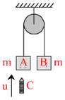 A massless inelastic thread passes over a small frictionless pulley. Two identical blocks A and B of mass m = 2 kg are attached with the thread. The system is initially at rest. A bullet C also of mass m strikes the block A from below with initial speed u as shown in figure and gets embedded in block A at t = 0 second. Then