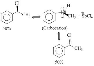 A solution of (-) -1-chloro-1-phenylethane in toluene racemises slowly in the presence of a small amount of SbCl5, due to the formation of :-