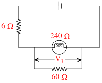 The supply voltage to a room is 120V. The resistance of the lead wires is 6Ω. A 60 W bulb is already switched on. What is the decrease of voltage across the bulb, when a 240 W heater is switched on in parallel to the bulb?