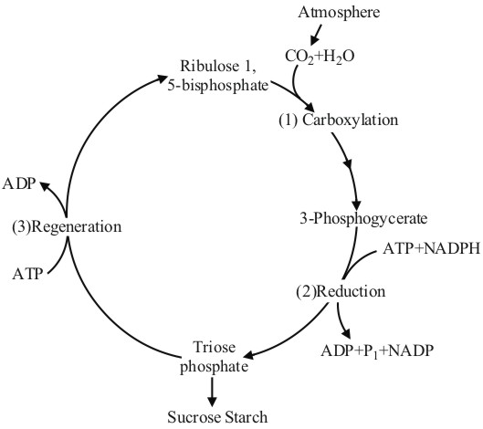 The Calvin cycle proceeds in three stages (1)carboxylation, during which CO2 combines with ribulose-1.5-bisphosphate (2) reduction, during which carbohydrate is formed at the expense of the photochemically made ATP and NADPH and (3) regeneration during which the CO2 acceptor ribulose-1,5-bisphosphate is formed again so that the cylcle continues. It might help you to understand all of this if we look at what goes in and what comes out of the Calvin cycle.