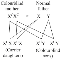 A colourblind mother and normal father would have colourblind sons and carrier daughters. Daughters will be normal phenotypically but they will be carrier genotypically.