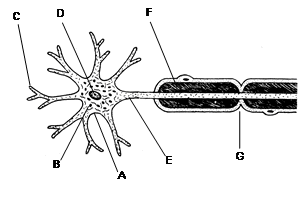 D.A = Cell body, B = Nissl bodies, C = Dendrites, D = Nucleus, E = Naked portion of axon, F = Myelin sheath, G = Node of Ranvier