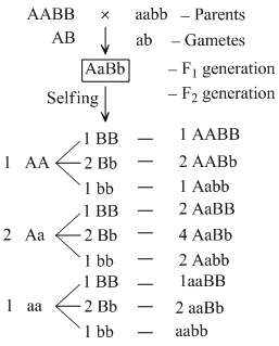 In a dihybrid cross AABB × aabb, F2 progeny of AABB, AABb, AaBB and AaBb occurs in the ration of