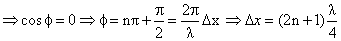 In the Young′s double slit experiment using a monochromatic light of wavelength λ, the path difference (in terms of an integer n) corresponding to any point having half the peak intensity is :-