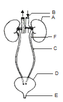 A.A = Kidney, B = Abdominal aorta, C = Ureters, D = Urinary bladder, E = Urethra, F = Renal pelvis