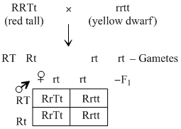 In a plant, red fruit (R) is dominant over yellow fruit (r) and tallness (T) is dorminant over Shortness (t). If a plant with RRTt genotype is crossed withe a plant the is rrtt,