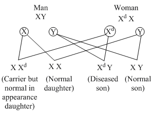 A gentic characteristic that is determined by genes located on the sex chomosomes (X or Y) are called sex linled characteristics and tha condition ehere expression of linked genes is limited to one sex is called sex limited characteristics. In given problem, disease is the result of sex-linked recessive genes. AS neither man nor woman show signs of disease it means womas would be carrier for disease causing gene. In their children none-daughterwere suffer from disease, while the sons were suffer, it means daughters are also carrier (ie, X-linkes recessive).