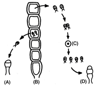 Life cycle of Ulothrix is shown in the diagram. The correct ploidy levels at the four stages A, B, C and D are