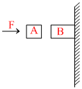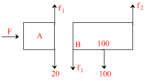 Given in the figure are two blocks A and B of weight 20 N and 100 N, respectively. These are being pressed against a wall by a force F as shown. If the coefficient of friction between the blocks is 0.1 and between block B and the wall is 0.15, the frictional force applied by the wall on block B is :-