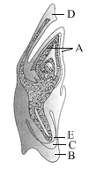 Identify the parts labelled A,B,C,D,E from the list (i- vii) and select the correct options.