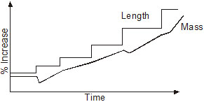 C.Increase in mass → moulting → simultaneous increase in body length and mass